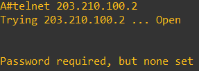telnet 203.210.100.2 (Router B의 IP주소)를 입력하여 Router A ➜ B로 telnet 연결을 시도한다. 이때 오류가 발생하는데, B에서 telnet password를 지정하지 않아서 그렇다. Telnet 연결을 이용하기 위해서는 telnet password 설정이 먼저 이루어져야 함!