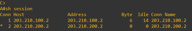 이제 C에서 잠깐 빠져나와 A로 간 후 show session을 확인해보면 위와 같다. 1번 address는 Router B, 2번 address는 Router C를 나타낸다. 마지막으로 빠져나온 telnet은 앞에 * 표시가 되어있다. Router C에 마지막으로 머물다가 빠져나온 것을 알 수 있다.