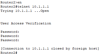 Router1에서 텔넷 설정을 해주었으므로 Router2에서 이 텔넷에 접근해보자. telnet [router1의 IP주소]를 입력하면 Router1에 접근하게 된다. 이때 Router1의 password를 입력하면 Router1의 IP인 10.1.1.1과 연결된다.