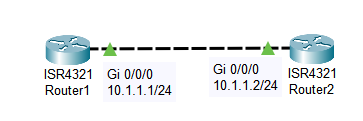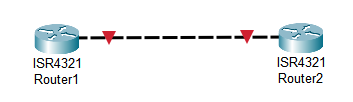 먼저 ISR4321 라우터 두 개를 설치하고 서로 연결해주었다. 같은 두 장비를 연결할 때는 Cross (점선)으로 연결하는 것이 국룰인데 (서로 다른 장비는 Staright로 연), 최신 장비일수록 Straight (실선) / Cross (점선) 중 어떤것으로 연결하더라도 장비 내에서 알아서 조정하여 회선을 바꿀 수 있다고 한다.