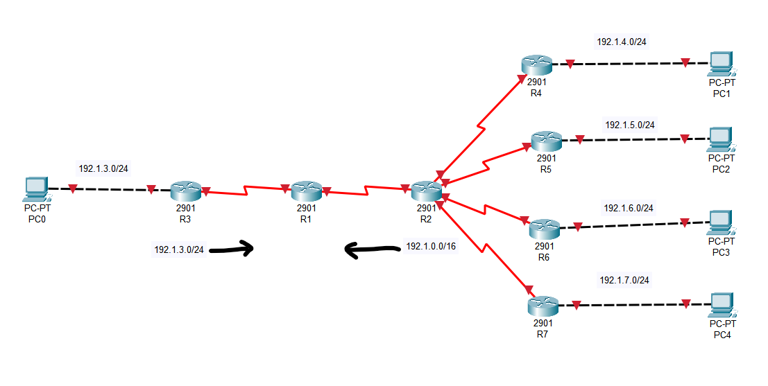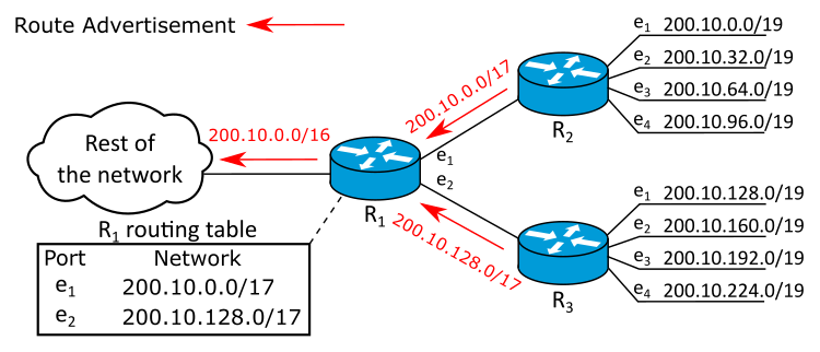 위 네트워크에서 R2는 자신이 알고있는 4개의 네트워크를 상세하게 광고하지 않고 192.1.0.0/16으로 광고한다. 즉, 192.1으로 시작하는 패킷은 전부 다 R2로 전송하라는 것이다. 이때 R1이 목적지 IP 주소가 192.1.3.1인 패킷을 수신하면 R1은 이를 R2가 아닌 R3으로 전송한다.