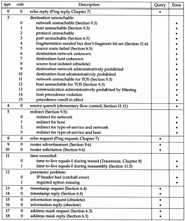 ICMP(Internet Control Message Protocol)는 PC, 서버, 라우터, 스위치 등 네트워크에 연결되어 있는 장비의 동작 상태를 확인할 때 사용하는 포로토콜이다. ICMP 패킷의 헤더에는 다음 표와 같은 type, code 필드가 존재하며 이 값들을 이용하여 특정 작업을 요청 / 응답한다.
