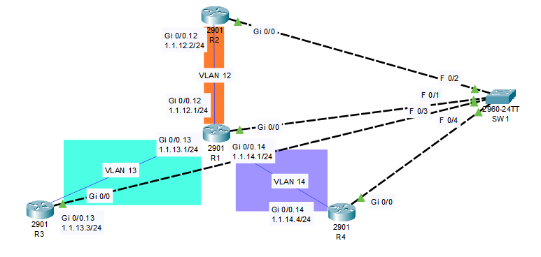 Switch 설정은 위와 같다. 4개의 라우터 경로를 각각 논리적으로 분할하기 위해 VLAN을 총 3개 설정했고, VLAN 각각의 이름은 12, 23, 34이다. 또한 R1은 VLAN 12에 속하도록 했는데, 그렇다면 이와 연결되는 R2의 Gi 0/0.12도 VLAN 12에 속하도록 설정해야한다.