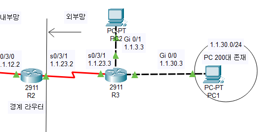 예를들어 R3의 Gi0/0 interface와 연결된 200대가 넘는 PC들이 전부 1.1.30.0/24 network에 속한다고 해보자. 이때 이 PC들이 내부망과 연결하기 위해 R2에서 ACL를 설정한다면 다음처럼 하나하나 전부 설정해주어야 하는 참사가 발생한다.