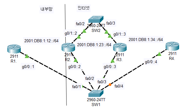 이제 R1에서 R4으로 ping이 가능하다. 여기까지 왔으면 IPv6 ACL을 설정을 시작할 수 있다. (드디어...!)