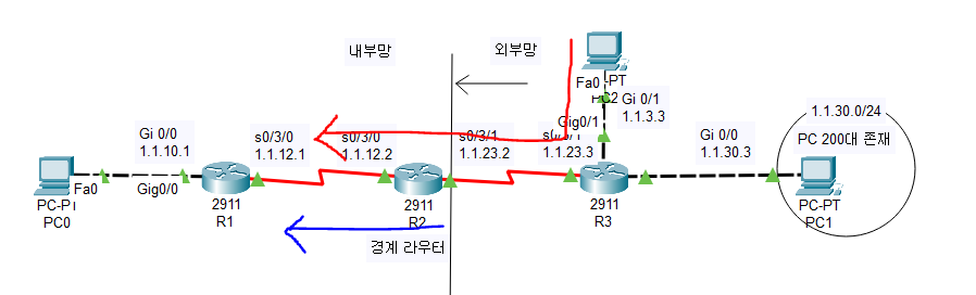 이번에는 위에서 정의한 네트워크를 내부망/외부망으로 분리하여 생각한다. 이때 외부 네트워크와 연결되는 라우터를 경계 라우터 (Perimeter router)라고 하는데, 보통 경계 라우터의 외부 인터페이스에서 내부 네트워크로 들어오는 패킷들을 제어(permit/deny)하는 경우가 많다.