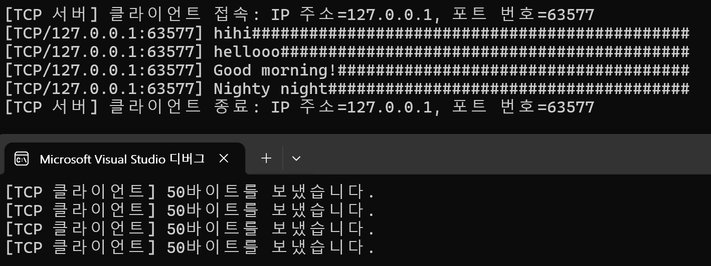 실행 결과는 위와 같다. TCP Client는 문자열 길이와 상관 없이 항상 한 번에 50bytes를 전송한다.