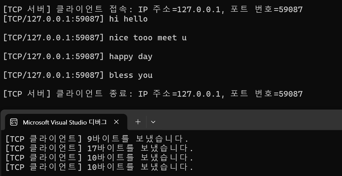 위 소스코드를 이용하여 TCP Server-Client 통신을 수행해보면 다음과 같은 결과를 얻는다.