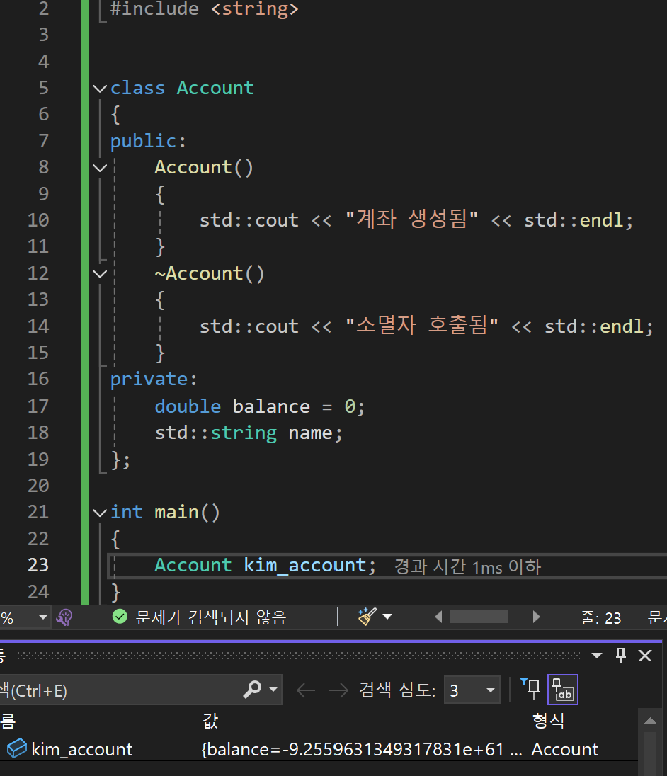 또한, class로 만들어낸 객체는 자신이 생성된 지역을 벗어나면 자동으로 소멸되는데, 여기서는 main 함수를 벗어날 때 자동으로 소멸자가 호출되며 객체가 소멸한다. 이 코드에서는 설정한대로 "소멸자 호출됨" 이라는 문구가 출력된다.