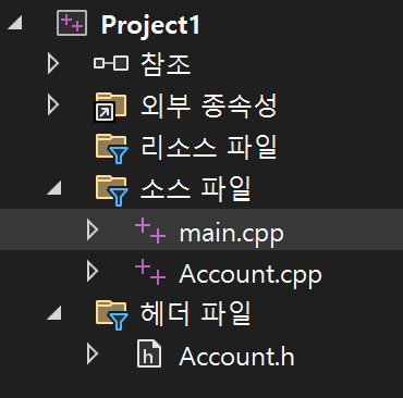 예를 들면 Account 클래스에 대한 정의는 헤더 파일 폴더의 Account.h에 해두고, 해당 클래스에 존재하는 멤버 함수들에 대한 정의는 소스 파일 폴더의 Account.cpp에 정의한다. 마지막으로 사용자는 해당 클래스는 main.cpp에서 사용하는 것이다.