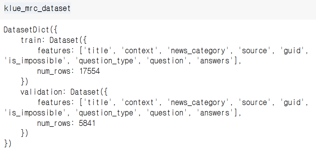허깅페이스에서 불러온 데이터셋을 출력해보면 해당 데이터셋 dict가 어떤 형태로 저장되어있는지 보여준다. 여기서는 train 혹은 validation에 접근하여 title, context ... 등 찍어보면 어떤 형태로 데이터의 이름 / 맥락 등이 저장되어 있는지 볼 수 있다.